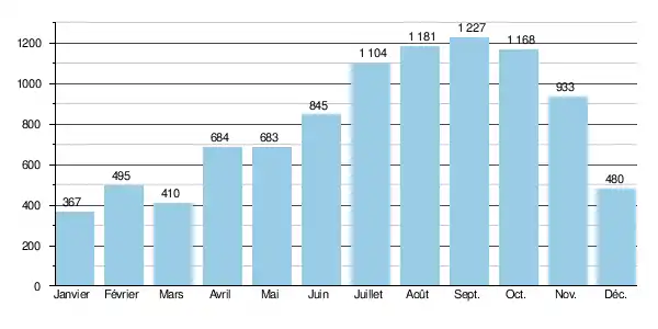 Sur la durée d'observation de 27 ans, le débit minimum mensuel observé a été de 23 m3/s (en mars), tandis que le débit maximal mensuel enregistré se montait à 4 586 m3/s (en avril).