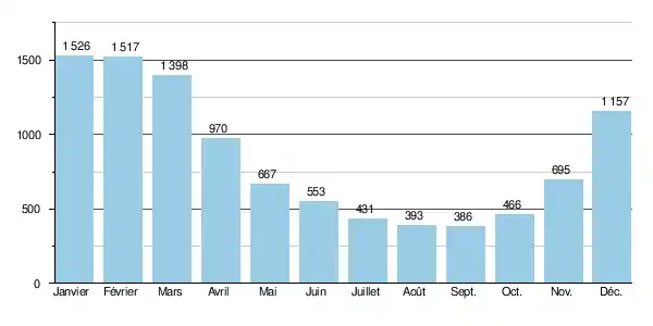 Sur la durée d'observation de 56 ans, le débit mensuel minimum observé a été de 46 m3/s (en , année de grande sècheresse dans la région), tandis que le débit mensuel maximal se montait à 3 660 m3/s (en ).