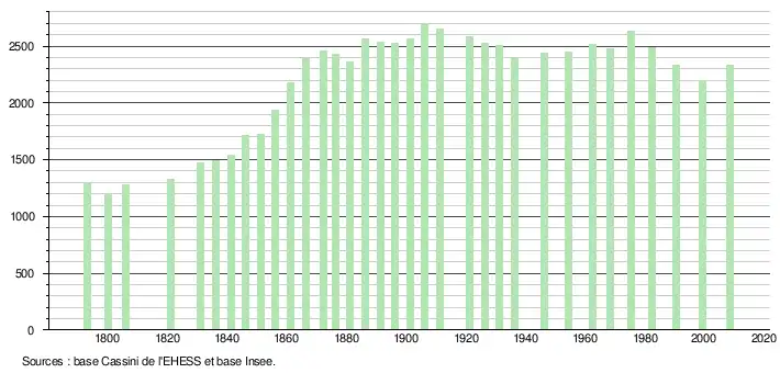 - Par convention dans Wikipédia, le principe a été retenu de n’afficher dans le tableau des recensements et le graphique, pour les populations légales postérieures à 1999, que les populations correspondant à une enquête exhaustive de recensement pour les communes de moins de 10 000 habitants, et que les populations des années 2006, 2011, 2016, etc. pour les communes de plus de 10 000 habitants, ainsi que la dernière population légale publiée par l’Insee pour l'ensemble des communes.