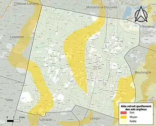 Le retrait-gonflement des sols argileux est susceptible d'engendrer des dommages importants aux bâtiments en cas d’alternance de périodes de sécheresse et de pluie. 23,8 % de la superficie communale est en aléa moyen ou fort (19,2 % au niveau départemental et 48,5 % au niveau national). Sur les 1 354 bâtiments dénombrés sur la commune en 2019, 230 sont en aléa moyen ou fort, soit 17 %, à comparer aux 17 % au niveau départemental et 54 % au niveau national. Une cartographie de l'exposition du territoire national au retrait gonflement des sols argileux est disponible sur le site du BRGM[23],[24].