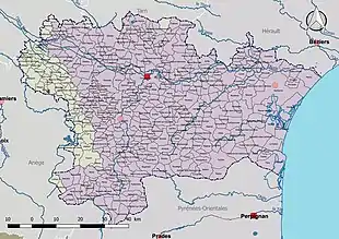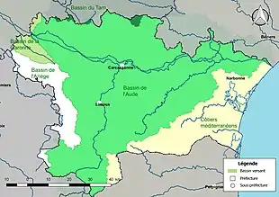 Les principaux bassins versants du département sont ceux de l'Aude, de la Berre (au sud-est) et, marginalement, ceux de la Verdouble (au sud, affluent de l'Agly), de l'Hers-Vif et l'Hers-Mort (à l'ouest, affluents respectivement de l'Ariège et de la Garonne).
