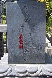 Sur le côté du monument en pierre, est gravé le nom de la personne qui a fait l’acquisition du caveau. Les noms des défunts sont gravés sur la face de la pierre. Mais il est de plus en plus fréquent que le nom du défunt soit aussi écrit sur une pièce en bois placée à côté du caveau : un sotoba (卒塔婆). Il est possible, en se rendant dans un cimetière japonais, de voir sur certains monuments en pierre, surplombant les caveaux, des caractères peints en rouge. En effet, lorsqu’une personne mariée décède, homme ou femme, le nom de son conjoint est gravé sur la pierre et peint en rouge. Cette peinture symbolise la volonté des époux de se rejoindre dans la tombe. Ainsi, lorsque le second membre du couple décède, la peinture est alors effacée. Notons tout de même que cette pratique est de moins en moins suivie de nos jours.