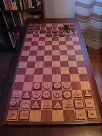 Le jeu utilise un plateau ressemblant à un échiquier, avec huit cases sur le côté court, mais seize sur le côté long. Les formes utilisées pour les pièces sont des triangles, carrés et ronds. Les pyramides peuvent être formées en empilant des pièces. Le jeu est remarquable dans le fait que les forces des blancs et des noirs ne sont pas symétriques. Bien que chaque camp ait le même tableau de pièces, les nombres inscrits sur chacun diffère, permettant différentes possibilités de capture et de configurations gagnantes pour les deux joueurs.