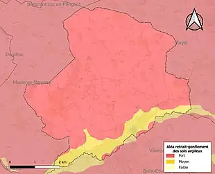 Le retrait-gonflement des sols argileux est susceptible d'engendrer des dommages importants aux bâtiments en cas d’alternance de périodes de sécheresse et de pluie[19]. La totalité de la commune est en aléa moyen ou fort (91,8 % au niveau départemental et 48,5 % au niveau national)[Carte 2]. Depuis le , en application de la loi ELAN, différentes contraintes s'imposent aux vendeurs, maîtres d'ouvrages ou constructeurs de biens situés dans une zone classée en aléa moyen ou fort[Note 2],[20].