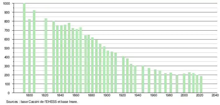 L'évolution du nombre d'habitants est connue à travers les recensements de la population effectués dans la commune depuis 1793. Pour les communes de moins de 10 000 habitants, une enquête de recensement portant sur toute la population est réalisée tous les cinq ans, les populations légales des années intermédiaires étant quant à elles estimées par interpolation ou extrapolation[19]. Pour la commune, le premier recensement exhaustif entrant dans le cadre du nouveau dispositif a été réalisé en 2006[20].