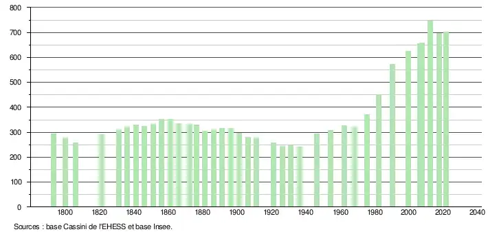L'évolution du nombre d'habitants est connue à travers les recensements de la population effectués dans la commune depuis 1793. Pour les communes de moins de 10 000 habitants, une enquête de recensement portant sur toute la population est réalisée tous les cinq ans, les populations légales des années intermédiaires étant quant à elles estimées par interpolation ou extrapolation[34]. Pour la commune, le premier recensement exhaustif entrant dans le cadre du nouveau dispositif a été réalisé en 2007[35].