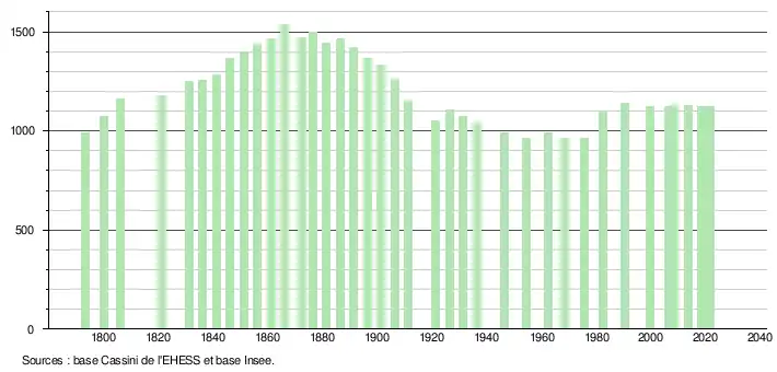 L'évolution du nombre d'habitants est connue à travers les recensements de la population effectués dans la commune depuis 1793. Pour les communes de moins de 10 000 habitants, une enquête de recensement portant sur toute la population est réalisée tous les cinq ans, les populations légales des années intermédiaires étant quant à elles estimées par interpolation ou extrapolation[27]. Pour la commune, le premier recensement exhaustif entrant dans le cadre du nouveau dispositif a été réalisé en 2008[28].
