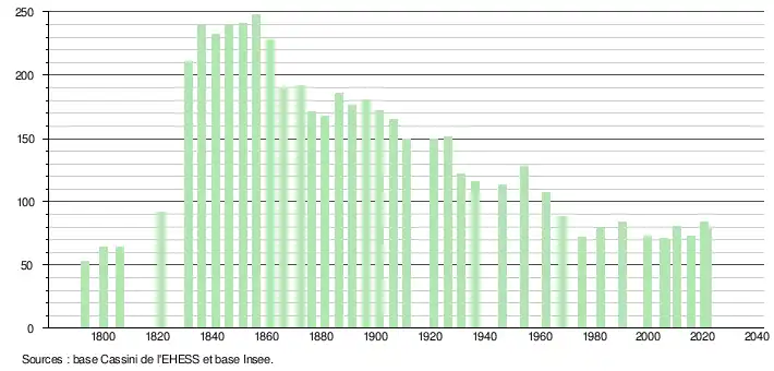 L'évolution du nombre d'habitants est connue à travers les recensements de la population effectués dans la commune depuis 1793. Pour les communes de moins de 10 000 habitants, une enquête de recensement portant sur toute la population est réalisée tous les cinq ans, les populations légales des années intermédiaires étant quant à elles estimées par interpolation ou extrapolation[16]. Pour la commune, le premier recensement exhaustif entrant dans le cadre du nouveau dispositif a été réalisé en 2005[17].