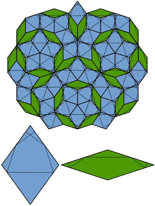 En 1984, quand la mise en évidence par Dan Shechtman deux ans plus tôt de quasi-cristaux à symétrie pentagonale est validée par la communauté scientifique, les pavages apériodiques, jusqu'alors perçus comme des mathématiques récréatives, deviennent un sujet de recherche universitaire à part entière. Peter Kramer (physicien) (en) et Roberto Neri développent un modèle mathématique de pavage quasipériodique de l'espace tridimensionnel au moyen des deux rhomboèdres d'or[8]. Ce pavage, équivalent 3D du pavage de Penrose, est désormais appelé pavage d'Ammann-Kramer-Neri (ou plus simplement AKN)[9].