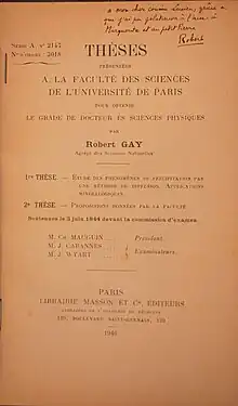 - Gay, Robert, « Étude des phénomènes de précipitation par une méthode de diffusion. Applications minéralogiques »