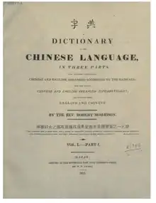 Le dictionnaire connu sous le nom de Morrison's Dictionnary (en), auquel Robert Morrison travailla pendant 16 ans[14], a été le premier dictionnaire chinois-anglais, anglais-chinois, devenu immédiatement un ouvrage de référence[28] considéré de plus comme très bien adapté à l'apprentissage de la langue chinoise[29]. Il est en grande partie basé sur le dictionnaire de caractères de Kangxi et sur un dictionnaire de rimes chinoises de la même époque, le Wuche Yunfu (chinois simplifié : 五车韵府 ; chinois traditionnel : 五車韻府 ; pinyin : )[29]. Cela signifie que ses notes tonales étaient celles du chinois moyen plutôt que celles réellement parlées à son époque. Étant donné les tuteurs dont il disposait, ses transcriptions reposaient sur le mandarin de Nankin plutôt que sur le dialecte de Pékin[30],[31].