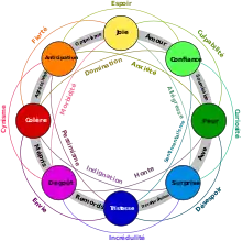 La théorie psycho-évolutionniste des émotions[2] de Robert Plutchik est l'une des méthodes de classification des réactions émotives générales. Plutchik considère qu'il y a huit émotions de base : la joie, la peur, le dégoût, la colère, la tristesse, la surprise, la confiance[N 1] et l'anticipation (en)[N 2]. Selon lui, ces émotions sont le reflet de combinaisons de neurotransmetteurs, autrement d'un mécanisme purement biologique qui a évolué pour faciliter l'adaptation de l'animal et a augmenté ses chances de se reproduire. Il a défendu leur primauté en montrant que chacune d'elles déclenche un comportement d'une grande valeur de survivance ; par exemple, la peur inspire la réaction de fuite ou de combat, la colère inspire la défense de ses acquis (dont la femelle), la tristesse implique le repos essentiel pour l'auto-préservation de l'organisme, la joie implique la recherche de ressources, etc.
