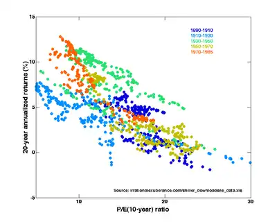 ![]() Ratio prix-gain financier comme prédicteur de 20 ans de retour sur investissement basé sur le graphe de Robert Shiller (Figure 10.1[15], source). L'axe horizontal de l'image est le ratio prix/gain financier de l'indice composite S&P, calculé dans le livre Exubérance Irrationnelle (prix ajusté de l'inflation divisé par le revenu sur dix ans ajusté également de l'inflation). L'axe vertical montre le retour annuel moyen sur l'indice composite S&P (dividendes reinvestis) et la vente vingt ans plus tard. Les données pour différentes périodes de 20 ans prennent des couleurs différentes comme le montre la légende. Il est également intéressant de voir le retour sur dix ans. Shiller montre que ce graphe « confirme que des investisseurs à long terme ont des retours sur investissement intéressants sur dix ans lorsque les prix sont bas comparés aux bénéfices au début de la période de dix ans. Les investisseurs à long terme devraient à titre individuel diminuer leur exposition lorsque le marché boursier est très élevé comme cela était le cas récemment et augmenter leur exposition lorsqu'il est bas[15]. » |