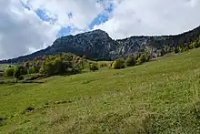 Le roc de Charmieux vu depuis Saint-Jean-de-Sixt au sud. | |||