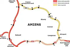 Autre caractéristique particulière : la rocade ouest (A16) est payante. Seuls les habitants d'Amiens Métropole peuvent souscrire un abonnement télépéage Liber-T auprès de la société concessionnaire Sanef leur permettant d'emprunter ce tronçon sans payer[2]. La rocade sud (A29) est gratuite à partir du péage de Dury, jusqu'au péage Jules Verne à Boves.