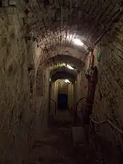 À l’issue du couloir, un long escalier rectiligne de 42 marches mène : à droite, au courtil sud et sur la sortie du musée et à gauche, sur deux petites salles de la tour d’angle et ses deux canonnières.