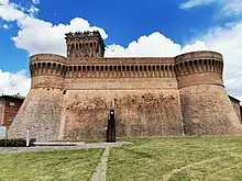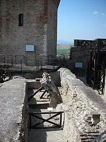 À l'origine la Rocca était unie aux murs du château par les tours Ouest et Sud; aujourd'hui il n'y a plus de continuité entre les murs du château et la Rocca à cause de l'ouverture des routes de la cité vers le dehors.