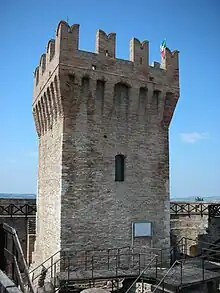 Cette tour était en effet utilisée comme dépôt et, en cas de siège, comme logement pour les occupants de la Rocca ; c'est pour cela que le sommet de cette tour présentait une couverture en bâtière, contrairement aux autres tours. Malgré cela, elle était également pourvue de deux niveaux de feu: le premier au sol (deux embrasures pour le tir de flanquement à défendre les courtines) et le second, supérieur, réalisé peut-être à l'abri des merlons pourvus de meurtrières.