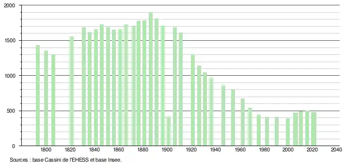 L'évolution du nombre d'habitants est connue à travers les recensements de la population effectués dans la commune depuis 1793. Pour les communes de moins de 10 000 habitants, une enquête de recensement portant sur toute la population est réalisée tous les cinq ans, les populations légales des années intermédiaires étant quant à elles estimées par interpolation ou extrapolation[24]. Pour la commune, le premier recensement exhaustif entrant dans le cadre du nouveau dispositif a été réalisé en 2005[25].