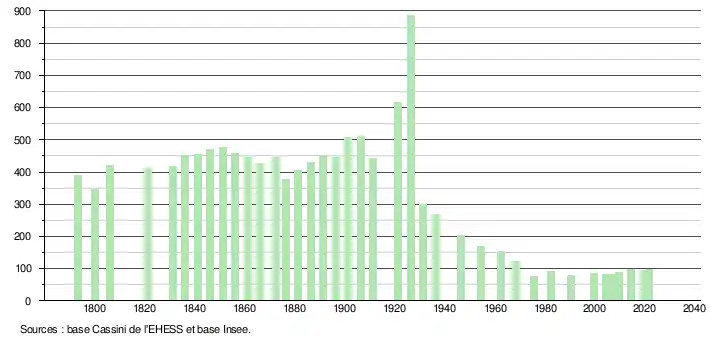 L'évolution du nombre d'habitants est connue à travers les recensements de la population effectués dans la commune depuis 1793. Pour les communes de moins de 10 000 habitants, une enquête de recensement portant sur toute la population est réalisée tous les cinq ans, les populations légales des années intermédiaires étant quant à elles estimées par interpolation ou extrapolation[23]. Pour la commune, le premier recensement exhaustif entrant dans le cadre du nouveau dispositif a été réalisé en 2004[24].