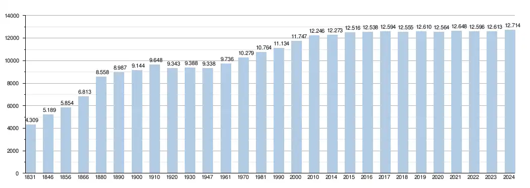 Elle comptait, au , 12 761 habitants (6 309 hommes et 6 452 femmes), soit une densité de 76,72 habitants/km²[2] pour une superficie de 166,34 km².
