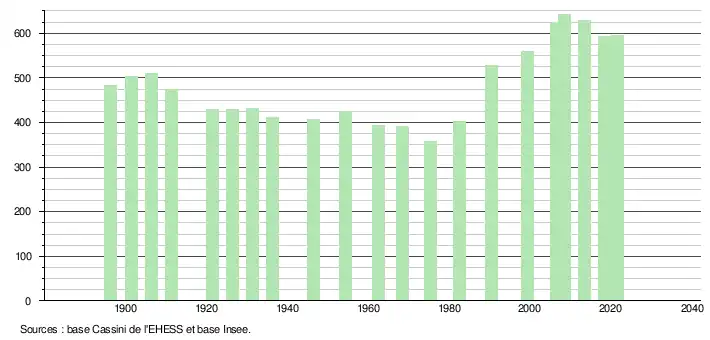 L'évolution du nombre d'habitants est connue à travers les recensements de la population effectués dans la commune depuis 1896. Pour les communes de moins de 10 000 habitants, une enquête de recensement portant sur toute la population est réalisée tous les cinq ans, les populations légales des années intermédiaires étant quant à elles estimées par interpolation ou extrapolation[22]. Pour la commune, le premier recensement exhaustif entrant dans le cadre du nouveau dispositif a été réalisé en 2008[23].
