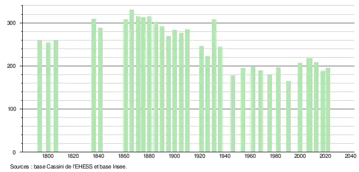 L'évolution du nombre d'habitants est connue à travers les recensements de la population effectués dans la commune depuis 1793. Pour les communes de moins de 10 000 habitants, une enquête de recensement portant sur toute la population est réalisée tous les cinq ans, les populations légales des années intermédiaires étant quant à elles estimées par interpolation ou extrapolation[21]. Pour la commune, le premier recensement exhaustif entrant dans le cadre du nouveau dispositif a été réalisé en 2007[22].
