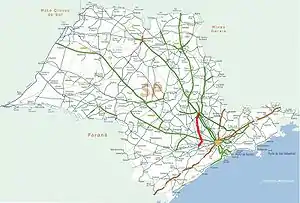 Carte de l'itinéraire de la Rodovia Santos Dumont (en rouge)