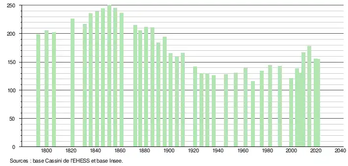 L'évolution du nombre d'habitants est connue à travers les recensements de la population effectués dans la commune depuis 1793. Pour les communes de moins de 10 000 habitants, une enquête de recensement portant sur toute la population est réalisée tous les cinq ans, les populations légales des années intermédiaires étant quant à elles estimées par interpolation ou extrapolation[17]. Pour la commune, le premier recensement exhaustif entrant dans le cadre du nouveau dispositif a été réalisé en 2004[18].