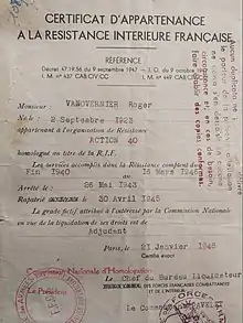 - Certificat d'appartenance à la résistance intérieure française de Roger Vanovermeir (illustration)