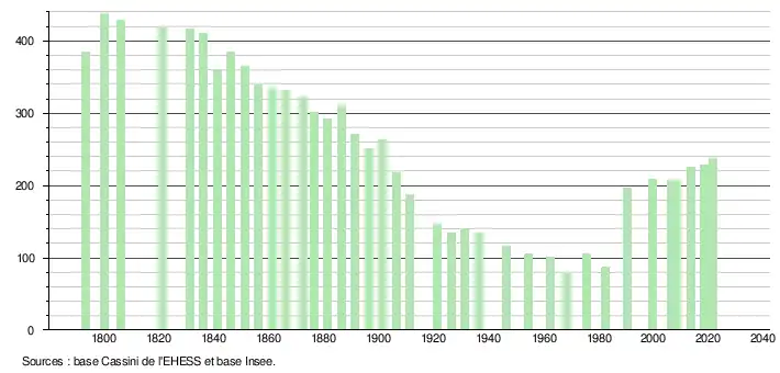 L'évolution du nombre d'habitants est connue à travers les recensements de la population effectués dans la commune depuis 1793. Pour les communes de moins de 10 000 habitants, une enquête de recensement portant sur toute la population est réalisée tous les cinq ans, les populations légales des années intermédiaires étant quant à elles estimées par interpolation ou extrapolation[15]. Pour la commune, le premier recensement exhaustif entrant dans le cadre du nouveau dispositif a été réalisé en 2008[16].