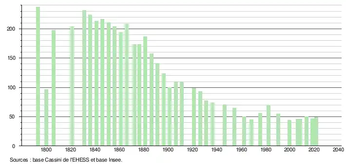 L'évolution du nombre d'habitants est connue à travers les recensements de la population effectués dans la commune depuis 1793. Pour les communes de moins de 10 000 habitants, une enquête de recensement portant sur toute la population est réalisée tous les cinq ans, les populations légales des années intermédiaires étant quant à elles estimées par interpolation ou extrapolation[17]. Pour la commune, le premier recensement exhaustif entrant dans le cadre du nouveau dispositif a été réalisé en 2008[18].