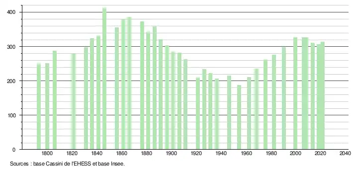 L'évolution du nombre d'habitants est connue à travers les recensements de la population effectués dans la commune depuis 1793. Pour les communes de moins de 10 000 habitants, une enquête de recensement portant sur toute la population est réalisée tous les cinq ans, les populations légales des années intermédiaires étant quant à elles estimées par interpolation ou extrapolation[23]. Pour la commune, le premier recensement exhaustif entrant dans le cadre du nouveau dispositif a été réalisé en 2008[24].