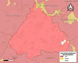Les mouvements de terrains susceptibles de se produire sur la commune sont des affaissements et effondrements liés aux cavités souterraines (hors mines) et des tassements différentiels[20]. Afin de mieux appréhender le risque d’affaissement de terrain, un inventaire national permet de localiser les éventuelles cavités souterraines sur la commune[21]. Le retrait-gonflement des sols argileux est susceptible d'engendrer des dommages importants aux bâtiments en cas d’alternance de périodes de sécheresse et de pluie[22]. 99,2 % de la superficie communale est en aléa moyen ou fort (79,5 % au niveau départemental et 48,5 % au niveau national)[Carte 2]. Depuis le , en application de la loi ÉLAN, différentes contraintes s'imposent aux vendeurs, maîtres d'ouvrages ou constructeurs de biens situés dans une zone classée en aléa moyen ou fort[Note 2],[23].