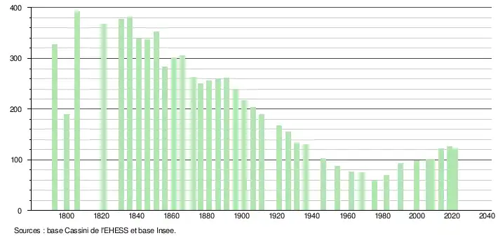 L'évolution du nombre d'habitants est connue à travers les recensements de la population effectués dans la commune depuis 1793. Pour les communes de moins de 10 000 habitants, une enquête de recensement portant sur toute la population est réalisée tous les cinq ans, les populations légales des années intermédiaires étant quant à elles estimées par interpolation ou extrapolation[15]. Pour la commune, le premier recensement exhaustif entrant dans le cadre du nouveau dispositif a été réalisé en 2008[16].
