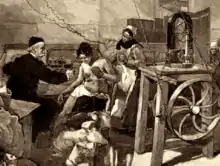Romain Vigouroux dans l'unité d'électrothérapie de la Salpêtrière, en 1887. Détail d'une gravure de Daniel Vierge (1851-1904) pour Le Monde illustré.