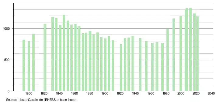 L'évolution du nombre d'habitants est connue à travers les recensements de la population effectués dans la commune depuis 1793. Pour les communes de moins de 10 000 habitants, une enquête de recensement portant sur toute la population est réalisée tous les cinq ans, les populations légales des années intermédiaires étant quant à elles estimées par interpolation ou extrapolation[17]. Pour la commune, le premier recensement exhaustif entrant dans le cadre du nouveau dispositif a été réalisé en 2007[18].