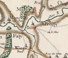 La carte de Cassini ci-contre montre qu'au milieu du XVIIIe siècle, Romery n'est pas une paroisse et ne possède donc pas d'église. Aujourd'hui encore, c'est l'église de Faty qui dessert le village. Le village est situé sur le rive gauche de l'Oise.