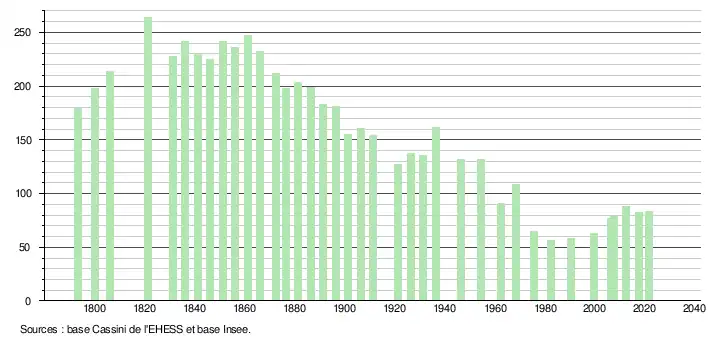 L'évolution du nombre d'habitants est connue à travers les recensements de la population effectués dans la commune depuis 1793. Pour les communes de moins de 10 000 habitants, une enquête de recensement portant sur toute la population est réalisée tous les cinq ans, les populations légales des années intermédiaires étant quant à elles estimées par interpolation ou extrapolation[27]. Pour la commune, le premier recensement exhaustif entrant dans le cadre du nouveau dispositif a été réalisé en 2007[28].