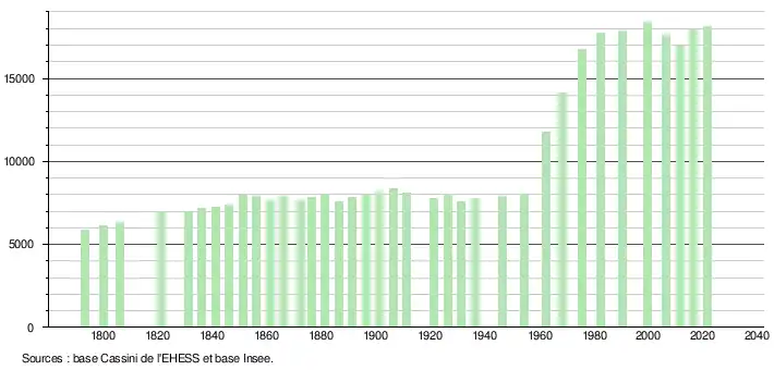 - Par convention dans Wikipédia, le principe a été retenu de n’afficher dans le tableau des recensements et le graphique, pour les populations légales postérieures à 1999, que les populations correspondant à une enquête exhaustive de recensement pour les communes de moins de 10 000 habitants, et que les populations des années 2006, 2011, 2016, etc. pour les communes de plus de 10 000 habitants, ainsi que la dernière population légale publiée par l’Insee pour l'ensemble des communes.