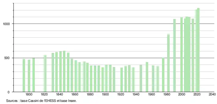 L'évolution du nombre d'habitants est connue à travers les recensements de la population effectués dans la commune depuis 1793. Pour les communes de moins de 10 000 habitants, une enquête de recensement portant sur toute la population est réalisée tous les cinq ans, les populations légales des années intermédiaires étant quant à elles estimées par interpolation ou extrapolation[23]. Pour la commune, le premier recensement exhaustif entrant dans le cadre du nouveau dispositif a été réalisé en 2004[24].