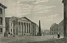 Étant donné que le successeur de Charles, Louis, s'était opposé à cette constitution, le portrait du grand-duc et le texte n'ont été gravés côté face qu'après sa mort en 1832. Il est inscrit CARL / GROSHERZOG VON BADEN (Charles / grand-duc de Bade) et côté arrière DEM GRUENDER DER / VERFASSUNG / DIE DANKBARE STADT / CARLSRUHE (Au fondateur de la constitution, la ville reconnaissante de Carlsruhe)[2]. Le monument est dès lors dédié à Charles, qui, par la constitution de Bade de 1818 a octroyé une des constitutions les plus libérales de son temps[3].