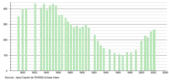 L'évolution du nombre d'habitants est connue à travers les recensements de la population effectués dans la commune depuis 1793. Pour les communes de moins de 10 000 habitants, une enquête de recensement portant sur toute la population est réalisée tous les cinq ans, les populations légales des années intermédiaires étant quant à elles estimées par interpolation ou extrapolation[28]. Pour la commune, le premier recensement exhaustif entrant dans le cadre du nouveau dispositif a été réalisé en 2005[29].