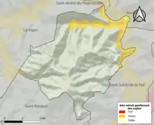 La commune est vulnérable au risque de mouvements de terrains constitué principalement du retrait-gonflement des sols argileux[22]. Cet aléa est susceptible d'engendrer des dommages importants aux bâtiments en cas d’alternance de périodes de sécheresse et de pluie. 11,2 % de la superficie communale est en aléa moyen ou fort (67,5 % au niveau départemental et 48,5 % au niveau national). Sur les 137 bâtiments dénombrés sur la commune en 2019, 21 sont en aléa moyen ou fort, soit 15 %, à comparer aux 90 % au niveau départemental et 54 % au niveau national. Une cartographie de l'exposition du territoire national au retrait gonflement des sols argileux est disponible sur le site du BRGM[23],[Carte 2].