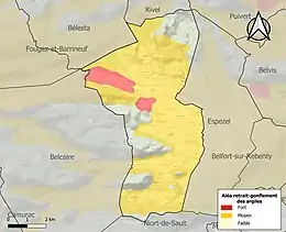 Le retrait-gonflement des sols argileux est susceptible d'engendrer des dommages importants aux bâtiments en cas d’alternance de périodes de sécheresse et de pluie. 78,5 % de la superficie communale est en aléa moyen ou fort (75,2 % au niveau départemental et 48,5 % au niveau national). Sur les 305 bâtiments dénombrés sur la commune en 2019, 293 sont en aléa moyen ou fort, soit 96 %, à comparer aux 94 % au niveau départemental et 54 % au niveau national. Une cartographie de l'exposition du territoire national au retrait gonflement des sols argileux est disponible sur le site du BRGM[22],[Carte 2].