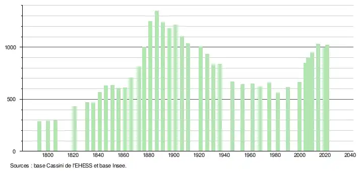 | L'évolution du nombre d'habitants est connue à travers les recensements de la population effectués dans la commune depuis 1793. Pour les communes de moins de 10 000 habitants, une enquête de recensement portant sur toute la population est réalisée tous les cinq ans, les populations légales des années intermédiaires étant quant à elles estimées par interpolation ou extrapolation[39]. Pour la commune, le premier recensement exhaustif entrant dans le cadre du nouveau dispositif a été réalisé en 2004[40]. En 2021, la commune comptait 1 021 habitants[Note 6], en diminution de 1,35 % par rapport à 2015 (Aude : +2,47 %, France hors Mayotte : +1,84 %). |