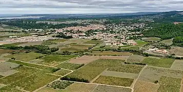 Paysage de garrigue dans l'angle sud-ouest de la commune. Vue vers le nord-est depuis les collines calcaires du Jurassique supérieur et du Crétacé inférieur. Au loin, au centre : le village de Roquefort-des-Corbières (avec Sigean et l'Étang de Bages-Sigean au-delà).