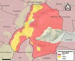 La commune est vulnérable au risque de mouvements de terrains constitué principalement du retrait-gonflement des sols argileux[38]. Cet aléa est susceptible d'engendrer des dommages importants aux bâtiments en cas d’alternance de périodes de sécheresse et de pluie. 82,8 % de la superficie communale est en aléa moyen ou fort (88,8 % au niveau départemental et 48,5 % au niveau national). Sur les 417 bâtiments dénombrés sur la commune en 2019, 397 sont en aléa moyen ou fort, soit 95 %, à comparer aux 98 % au niveau départemental et 54 % au niveau national. Une cartographie de l'exposition du territoire national au retrait gonflement des sols argileux est disponible sur le site du BRGM[39],[Carte 3].