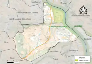 La commune fait partie du territoire à risques importants d'inondation (TRI) d'Avignon – plaine du Tricastin – Basse vallée de la Durance, regroupant 90 communes du bassin de vie d'Avignon, Orange et de la basse vallée de la Durance, un des 31 TRI qui ont été arrêtés fin 2012 sur le bassin Rhône-Méditerranée[18]. Il a été retenu au regard des risques de débordements du Rhône, de la Durance, de la Cèze, du Lez (84), de l'Ardèche, de l'Eygues, du Rieu (Foyro), de la Meyne, de l'Ouvèze, des Sorgues, des rivières du Sud-Ouest du mont Ventoux, de la Nesque, du Calavon et de l'Èze. Les crues récentes significatives sont celles d'octobre 1993 (Rhône-Lez), de janvier et novembre 1994 (Rhône, Durance, Calavon, Ouvèze), de décembre 1997, de novembre 2000, de mai 2008 (Durance), de décembre 2003 (Rhône, Calavon), de septembre 1992 (Ouvèze), de septembre 2002 et de 2003 (Aygue, Rieu Foyro), de septembre 1958, de septembre 1992 (Ardèche), de septembre 1993 (Èze). Des cartes des surfaces inondables ont été établies pour trois scénarios : fréquent (crue de temps de retour de 10 ans à 30 ans), moyen (temps de retour de 100 ans à 300 ans) et extrême (temps de retour de l'ordre de 1 000 ans, qui met en défaut tout système de protection)[19],[20]. La commune a été reconnue en état de catastrophe naturelle au titre des dommages causés par les inondations et coulées de boue survenues en 1982, 1987, 1991, 2002, 2003, 2004 et 2008[21],[16].
