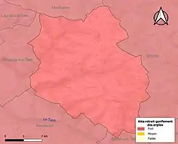 La commune est vulnérable au risque de mouvements de terrains constitué principalement du retrait-gonflement des sols argileux[22]. Cet aléa est susceptible d'engendrer des dommages importants aux bâtiments en cas d’alternance de périodes de sécheresse et de pluie. La totalité de la commune est en aléa moyen ou fort (76,3 % au niveau départemental et 48,5 % au niveau national). Sur les 200 bâtiments dénombrés sur la commune en 2019, 200 sont en aléa moyen ou fort, soit 100 %, à comparer aux 90 % au niveau départemental et 54 % au niveau national. Une cartographie de l'exposition du territoire national au retrait gonflement des sols argileux est disponible sur le site du BRGM[23],[Carte 3].